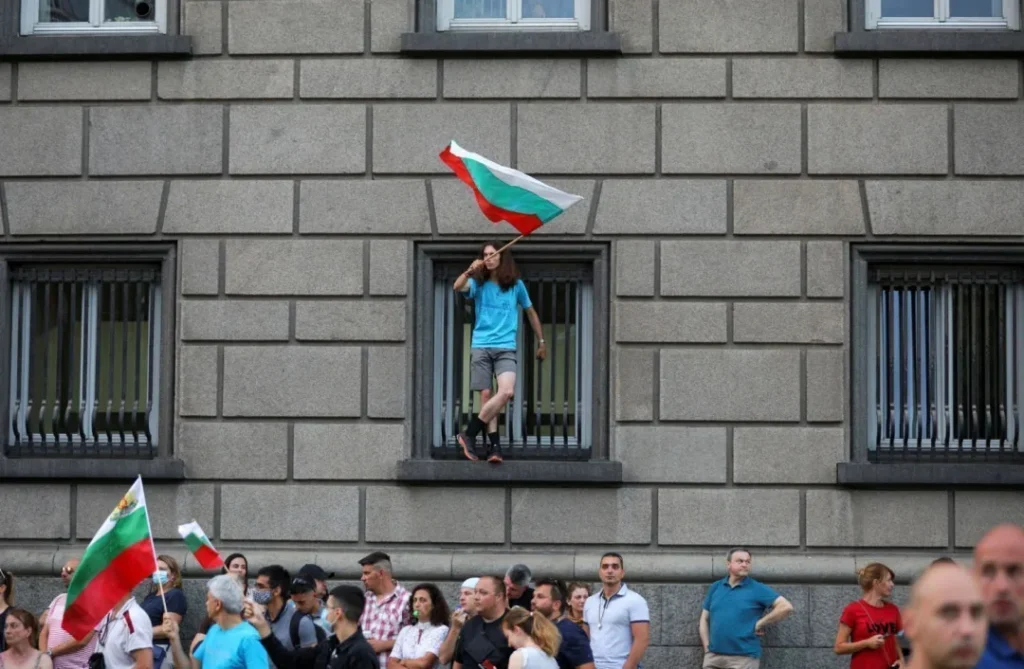 A demonstrator waves a Bulgarian flag while standing on a windowsill during an anti-government protest, in Sofia, Bulgaria July 21, 2020. REUTERS/Stoyan Nenov