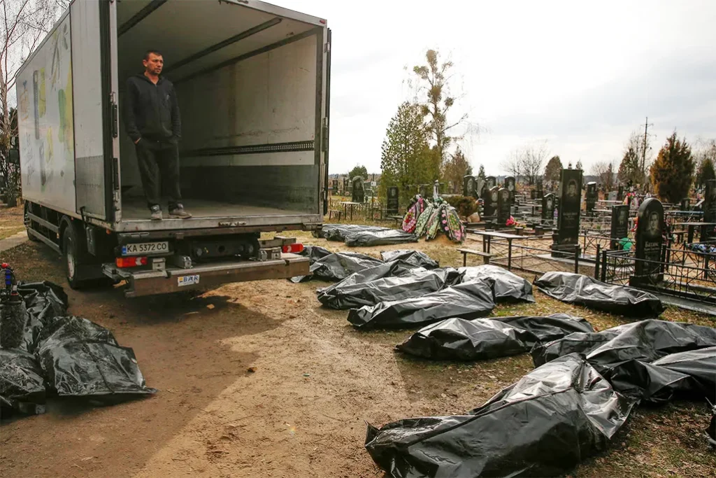 A funeral service employee looks at bodies of civilians, collected from streets and brought to a local cemetery, in the town of Bucha, outside Kyiv, Ukraine