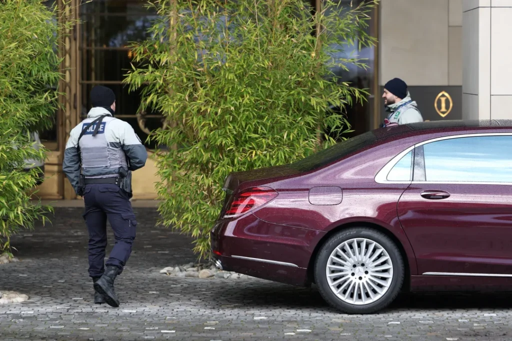 Police officers stand guard in front of the InterContinental hotel on the day of U.S.-mediated peace talks between Russia and Ukraine in Geneva, Switzerland, February 17, 2026. REUTERS/Pierre Albouy