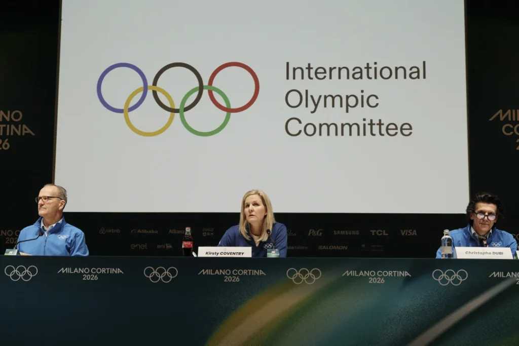 IOC Communications Director Mark Adams, IOC President Kirsty Coventry and IOC Olympic Games Executive Director Christophe Dubi during a press conference