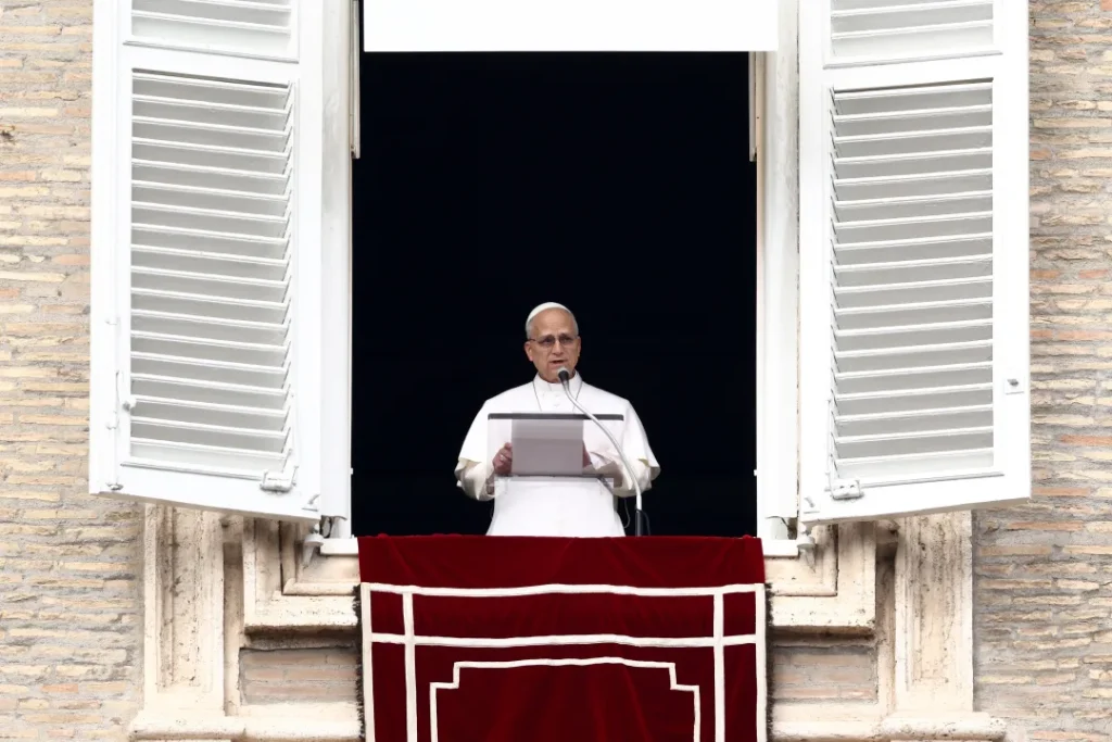 Pope Leo XIV leads the Angelus prayer from the window of the Apostolic Palace at the Vatican on Sunday