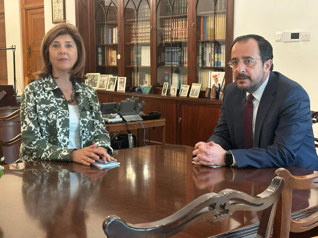 НИКОСИЯ, КИПР — Спецпосланник ООН Мария Анжела Ольгин прибывает на Кипр в четверг вечером для встреч с президентом Никосом Христодулидисом и лидером киприотов-турок Эрсином Татаром в преддверии запланированной трехсторонней встречи с Генеральным секретарем ООН Антониу Гутерришем.