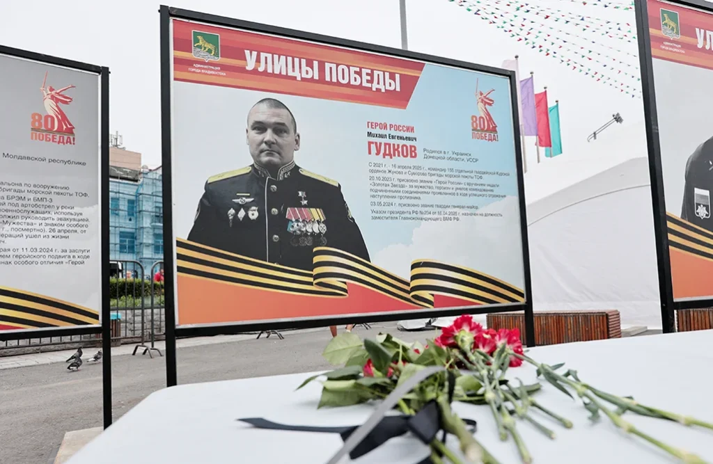 В дальневосточном портовом городе Владивостоке, где базируется Тихоокеанский флот России, участники траурной церемонии возложили цветы к портрету Гудкова, установленному на открытом воздухе, в рамках фотовыставки, посвящённой офицерам, которых Россия считает военными героями.