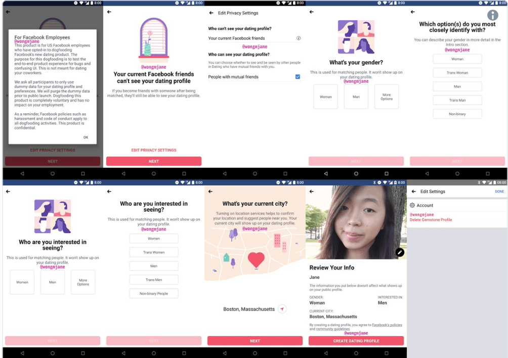 Сотрудники Facebook тестируют новый сервис Dating. Специалист по обратной разработке Джейн Вонг опубликовал его первые скриншоты.