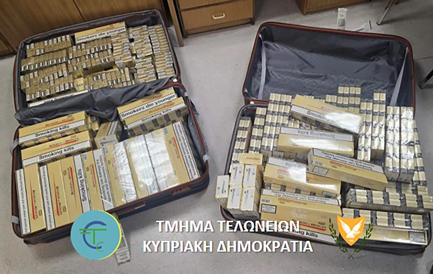 В понедельник полиция сообщила, что в аэропорту Ларнаки было изъято большое количество сигарет и табака для скручивания трубок. В рамках трёх отдельных инцидентов были арестованы трое человек.