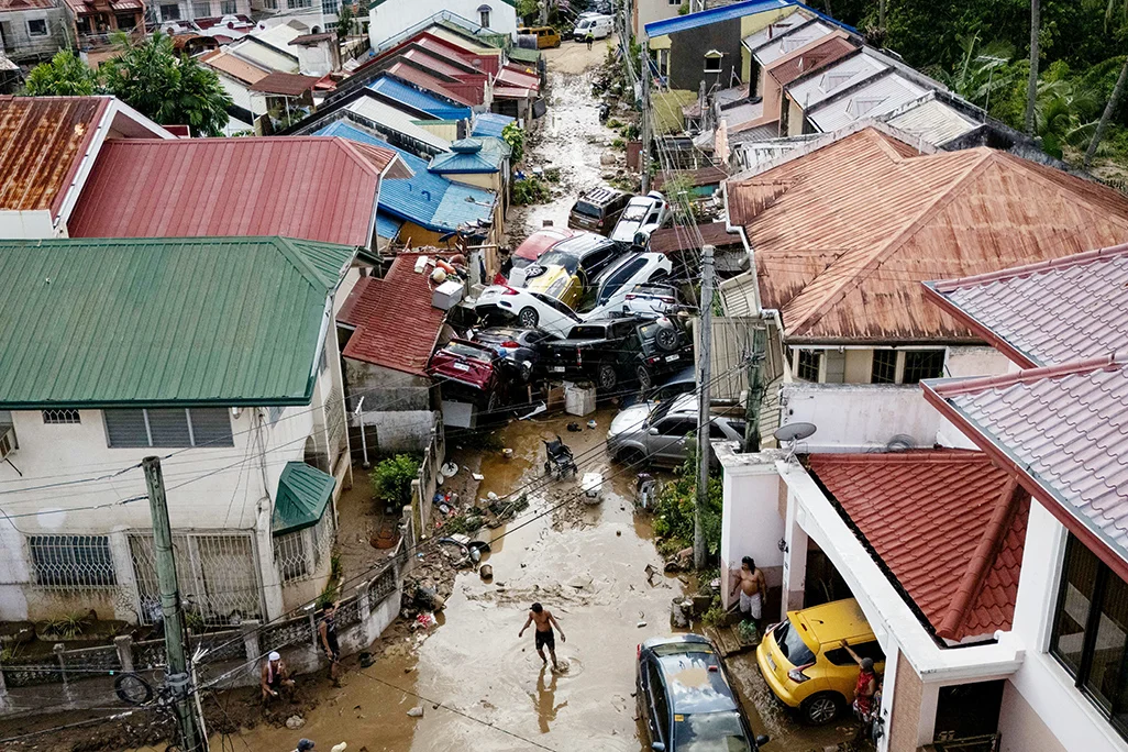 В Себу, крупном туристическом центре, по мере того как вода уходит, становится видна полная картина разрушений — перевёрнутые машины, обломки зданий и затопленные кварталы.