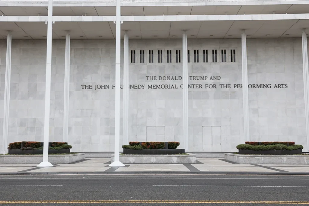 The facade of the recently renamed Donald J. Trump and John F. Kennedy Memorial Center for the Performing Arts, in Washington, DC