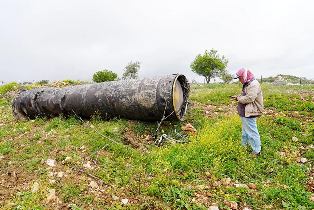 A person stands next to the remnant of an Iranian missile, in Beitin village near Ramallah, in the Israeli-occupied West Bank