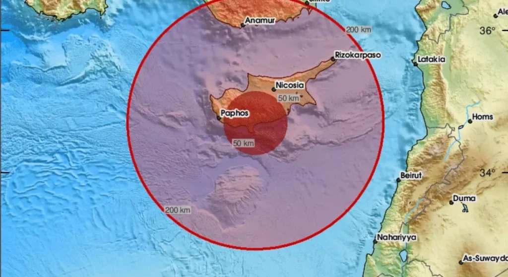 Согласно учебной модели, у южного побережья Ларнаки произошло землетрясение магнитудой 7,1.