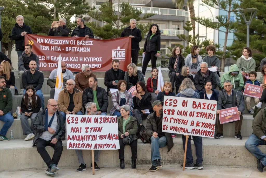 Во вторник в Лимассоле прошла антивоенная демонстрация, участники которой призывали к выводу британских военных баз с Кипра и осуждали операции под руководством США против Ирана, которые спровоцировали ответные удары беспилотников по острову. Протестующие у амфитеатра Молос в Лимассоле держали плакаты с надписями: “Долой базы. Долой все армии. Что делает Кипр в империалистических войнах?”