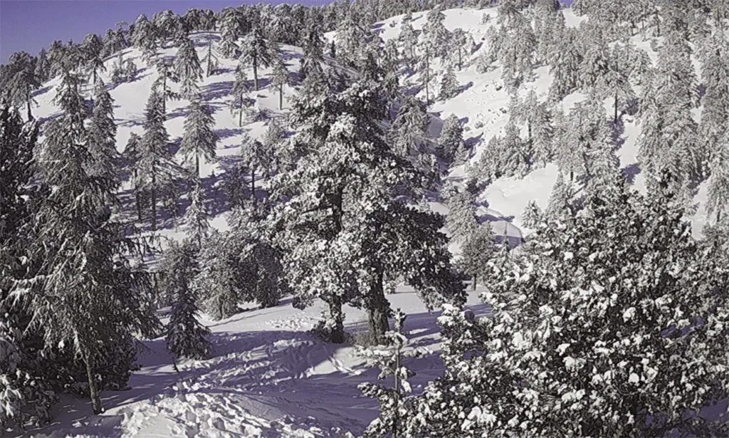 Троодос, Кипр. Горы Троодос были покрыты снегом в воскресенье ночью, что стало вторым снегопадом за зиму.