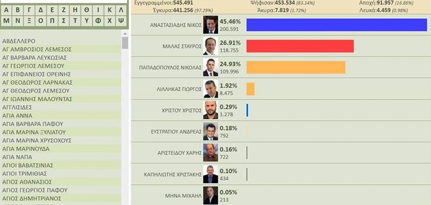 До президентских выборов, назначенных на 28 января, еще целая неделя. А их «официальные результаты» уже тиражируют в кипрском сегменте социальных сетей. Никос Анастасиадис набирает 45,46%. На втором месте — поддерживаемый Партией трудового народа (AKEL) Ставрос Малас с 26,91%. Замыкает тройку лидеров глава DIKO Николас Пападопулос с 24,93%. Фейковая новость за неделю до выборов? Нет. Просто ошибка при тестировании официального сайта.