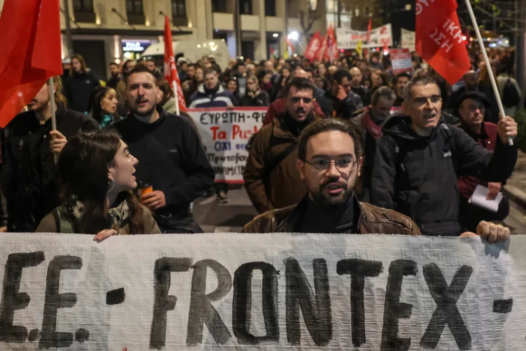 Protesters hold a banner against EU and Greek government policies towards migrants during a protest, following a deadly collision between a migrant boat and a coast guard vessel off the island of Chios, in Athens, Greece, February 5, 2026. REUTERS/Louisa Gouliamaki