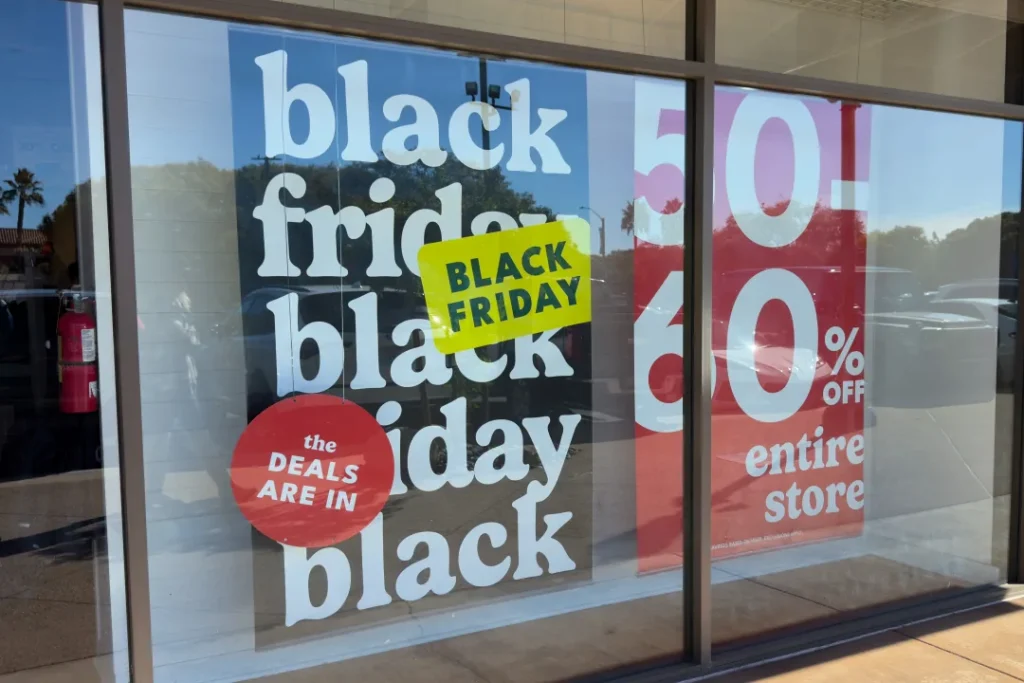 Black Friday sale signs are shown at an outdoor shopping mall in Carlsbad, California, U.S., November, 25, 2024. REUTERS/Mike Blake
