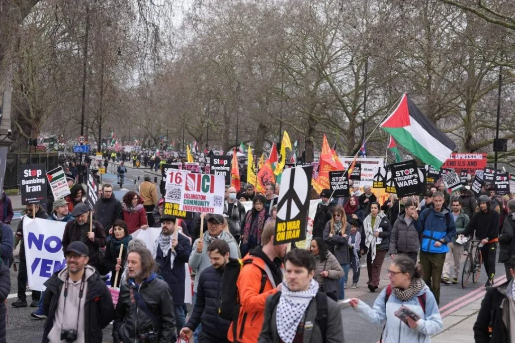 The march took place as regional instability intensified following the start of major combat operations against the Iranian government. Organisers in London described the strikes as “illegal” and warned the conflict was placing millions of civilians at risk.