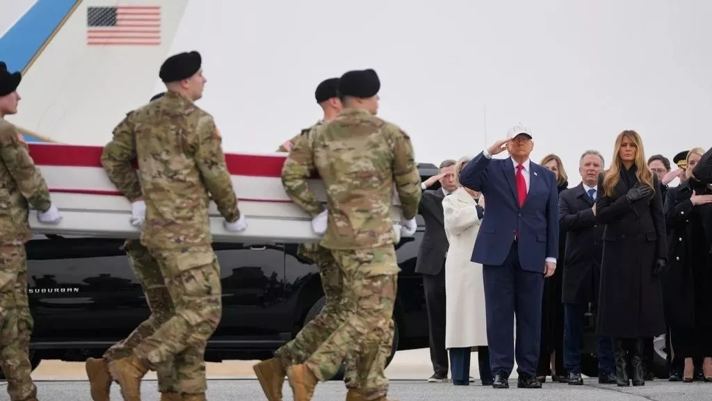 Dover, United States. President Donald Trump traveled to Dover Air Force Base on Saturday to participate in the dignified transfer of six U.S. service members killed during the initial phase of the Iran war. He was accompanied by First Lady Melania Trump, Defense Secretary Pete Hegseth, and Middle East envoy Steve Witkoff.