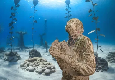Айя-Напа, Кипр. Скульптуры в подводном музее МУСАНА начали демонстрировать первые признаки трансформации, поскольку морские организмы начинают селиться на их поверхности….